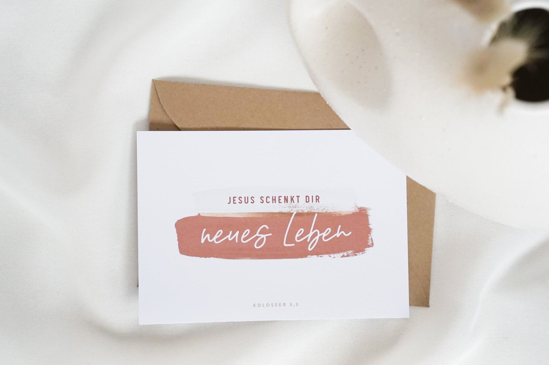 Jesus schenkt dir neues Leben. Die Karte erinnert daran, was Jesus uns geschenkt hat als er am Kreuz für uns starb und siegreich auferstand. Diese Karte ist eine Erinnerung daran, was Jesus für uns getan hat und wie sehr er uns liebt.