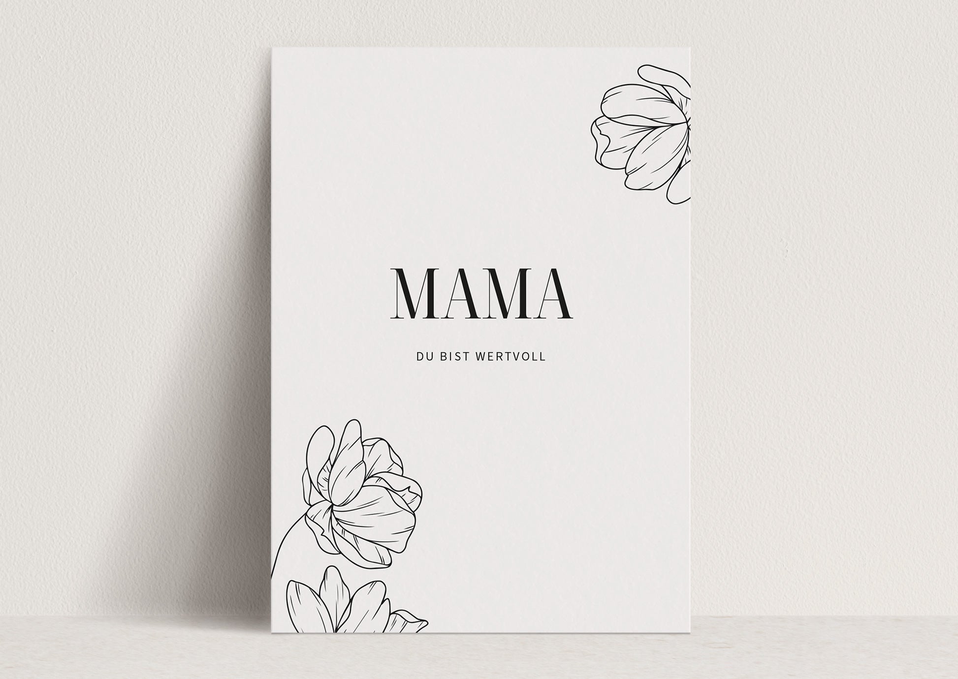 Diese liebevoll gestaltete Karte bringt auf den Punkt, was oft viel zu selten gesagt wird: „Du bist wertvoll.“ Der schlichte Schriftzug auf hellem Hintergrund wird von zarten Blumenillustrationen umrahmt, die dem Motiv eine warme, stilvolle Note verleihen. Ein wertschätzender Gruß zum Muttertag – oder zu jedem anderen Tag, an dem du deiner Mama zeigen möchtest, wie wichtig sie dir ist.