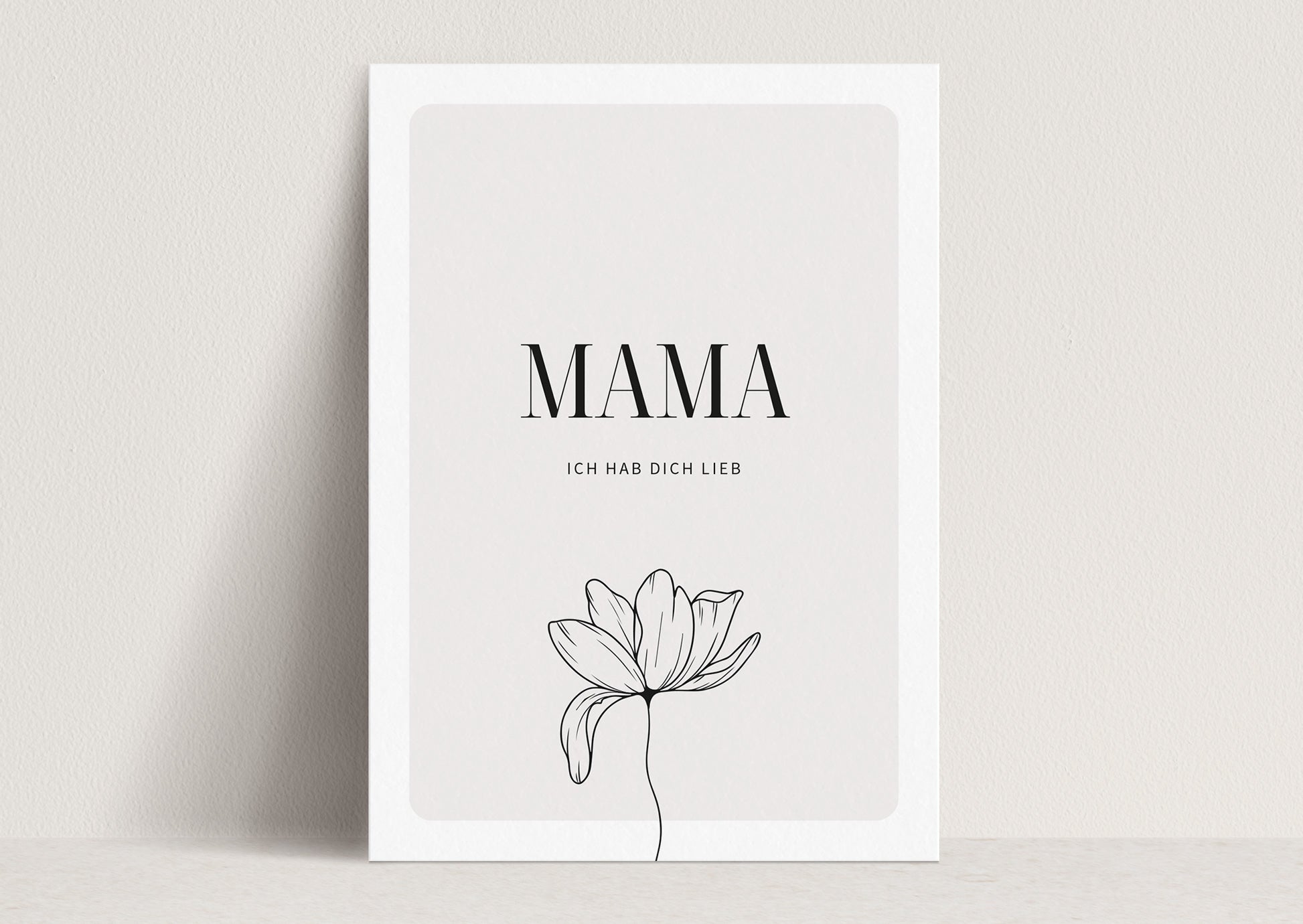 Diese minimalistisch gestaltete Karte ist ein liebevoller Gruß zum Muttertag. In schlichter Eleganz steht das Wort „MAMA“ im Mittelpunkt, begleitet von der Botschaft „Ich hab dich lieb“ – ehrlich, direkt und von Herzen. Die feine Blumenzeichnung am unteren Rand verleiht der Karte eine zarte, wertige Note. Ideal, um deiner Mama deine Liebe und Wertschätzung auszudrücken – nicht nur zum Muttertag, sondern auch einfach zwischendurch.