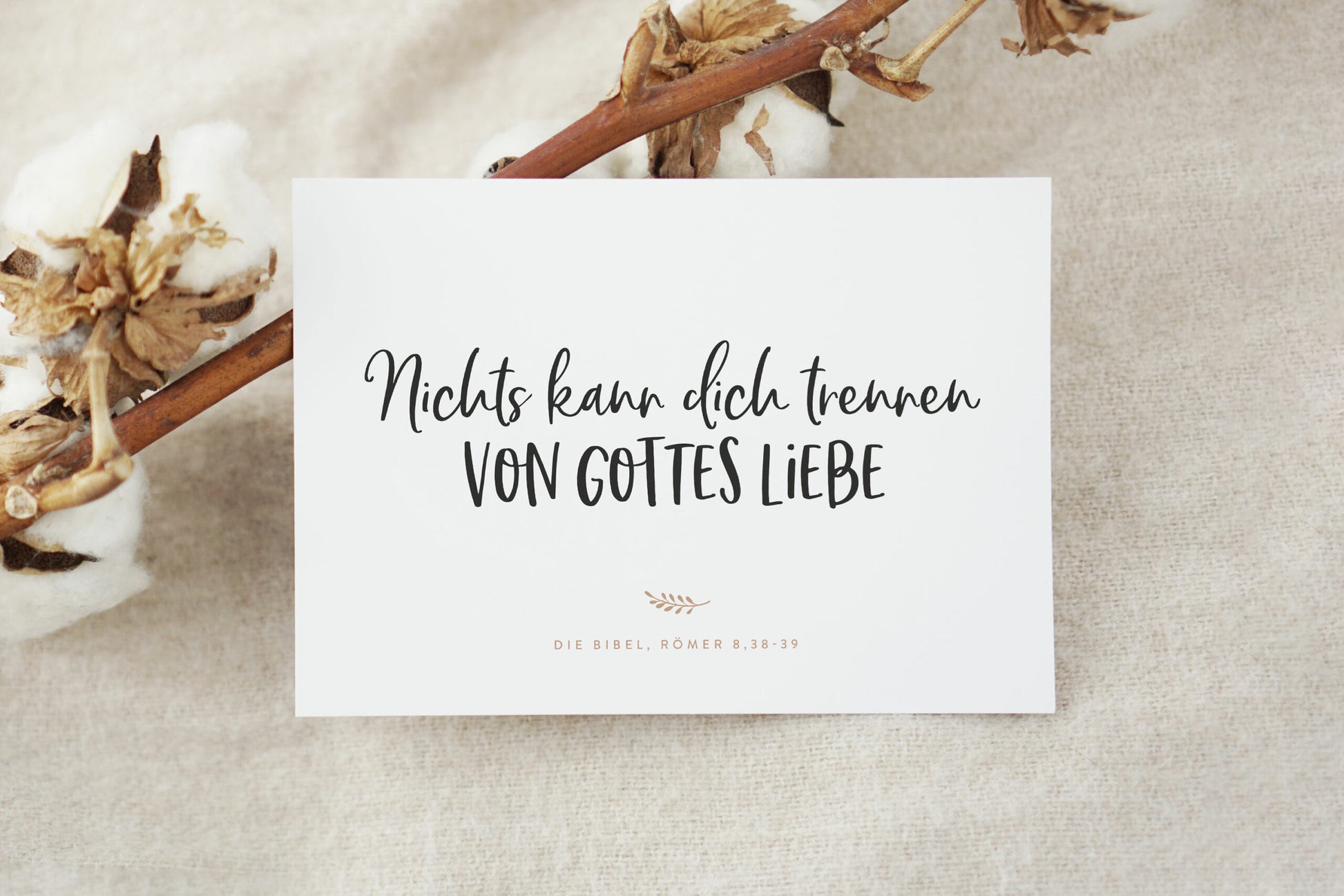 "Ich bin überzeugt: Nichts kann uns von seiner Liebe trennen. Weder Tod noch Leben, weder Engel noch Mächte, weder unsere Ängste in der Gegenwart noch unsere Sorgen um die Zukunft, ja nicht einmal die Mächte der Hölle können uns von der Liebe Gottes trennen. Und wären wir hoch über dem Himmel oder befänden uns in den tiefsten Tiefen des Ozeans, nichts und niemand in der ganzen Schöpfung kann uns von der Liebe Gottes trennen, die in Christus Jesus, unserem Herrn, erschienen ist." - Römer 8,38-39