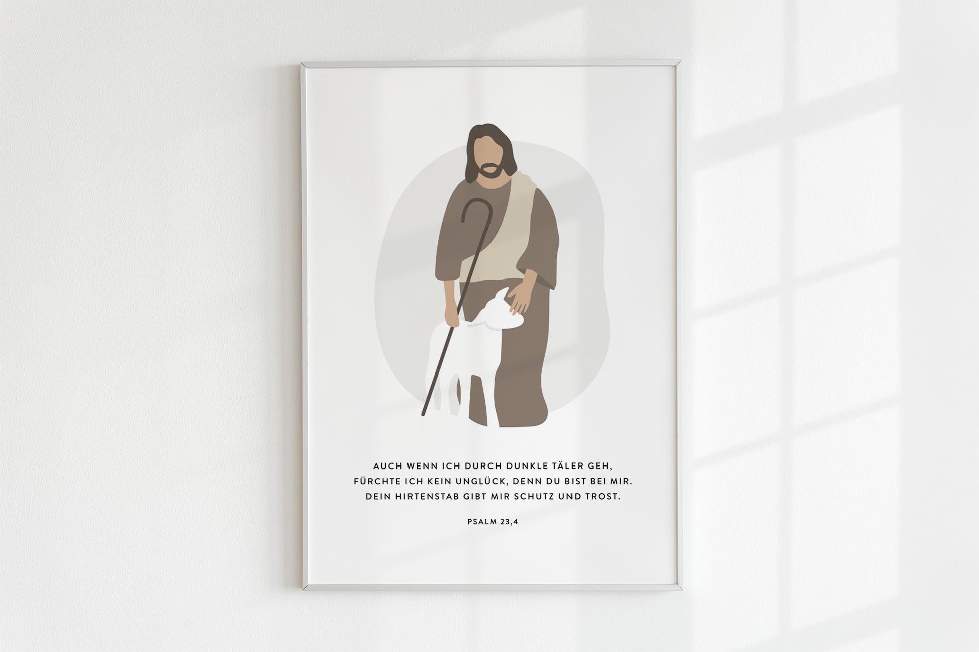 Psalm 23,4: Auch wenn ich durch dunkle Täler geh, fürchte ich kein Unglück, denn du bist bei mir. Dein Hirtenstab gibt mir Schutz und Trost. – Wunderschönes Poster mit christlichem Inhalt auf 170 g Papier (ohne Bilderrahmen). Dieses hochwertige Poster ist in den drei Größen A4, A3 und im Kunstdruck-Format 50 × 70 cm bestellbar.