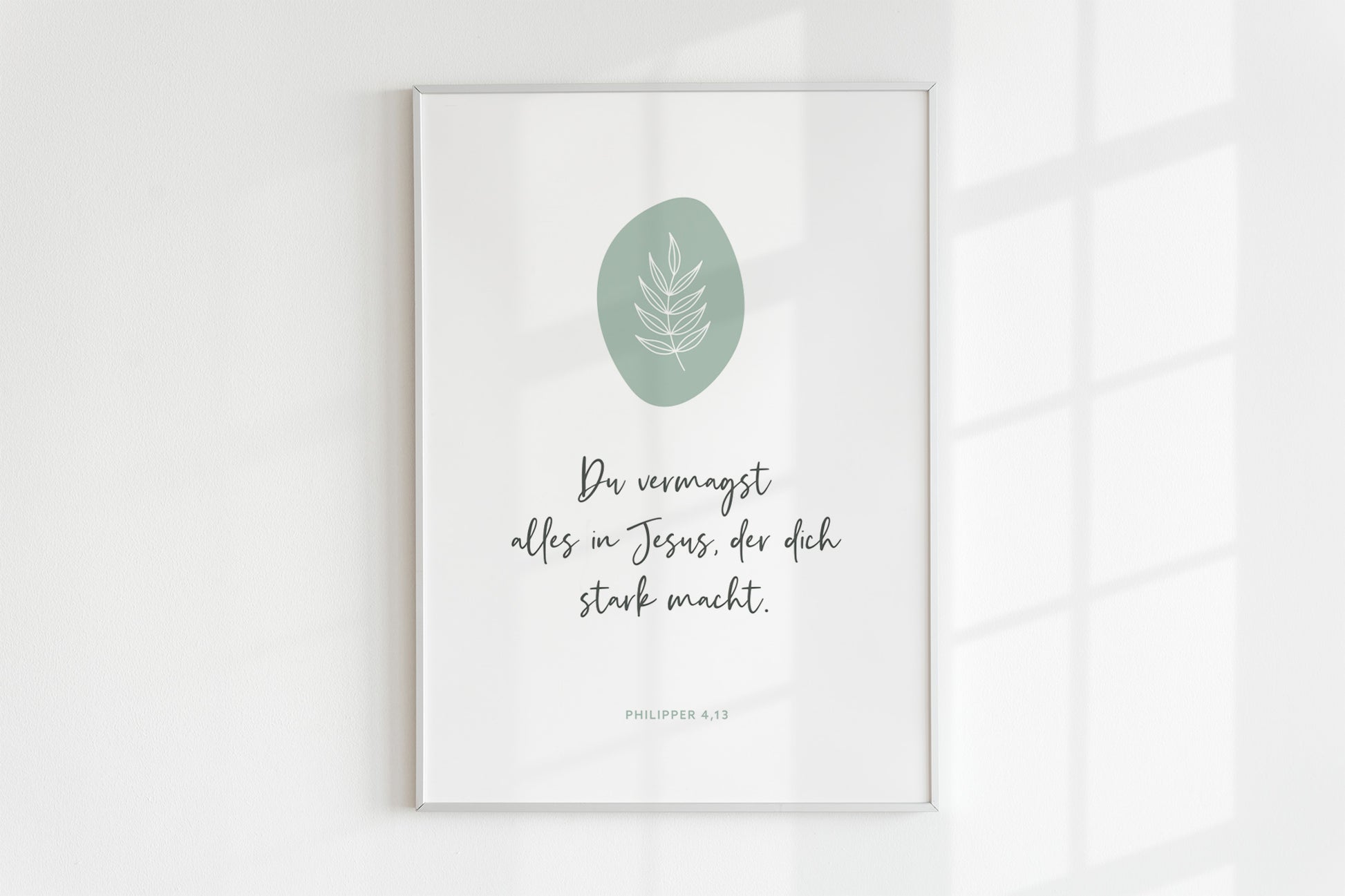 Du vermagst alles in Jesus, der dich stark macht. (Philipper 4,13): Wunderschönes Poster mit christlichem Inhalt auf 170 g Papier (ohne Bilderrahmen). Dieses hochwertige Poster ist in den drei Größen A4, A3 und im Kunstdruck-Format 50 × 70 cm bestellbar.