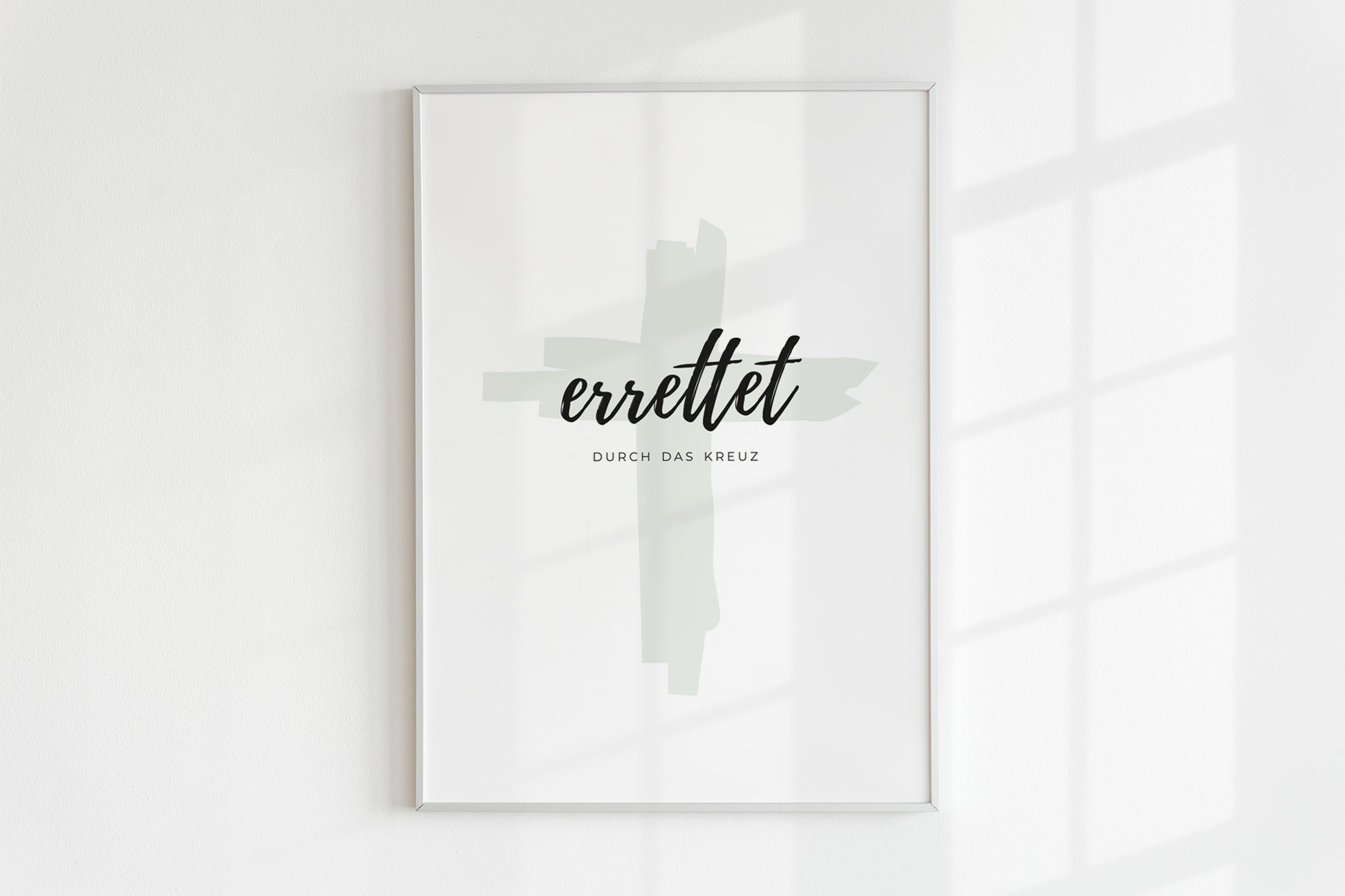 Errettet – Durch das Kreuz: Wunderschönes Poster mit christlichem Inhalt auf 170 g Papier (ohne Bilderrahmen). Dieses hochwertige Poster ist in den drei Größen A4, A3 und im Kunstdruck-Format 50 × 70 cm bestellbar.