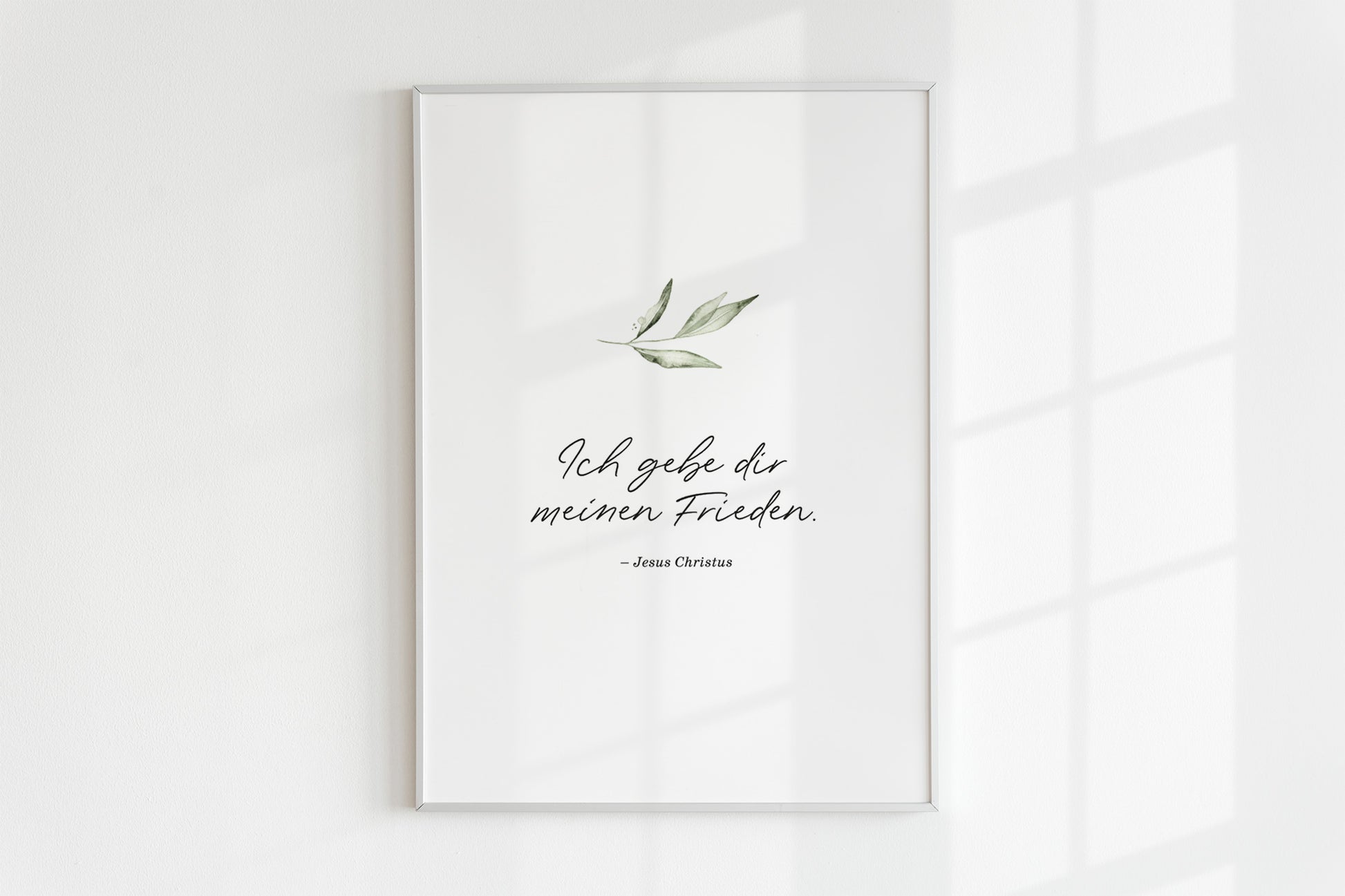 Ich gebe dir meinen Frieden: Wunderschönes Poster mit christlichem Inhalt auf 170 g Papier (ohne Bilderrahmen). Dieses hochwertige Poster ist in den drei Größen A4, A3 und im Kunstdruck-Format 50 × 70 cm bestellbar.