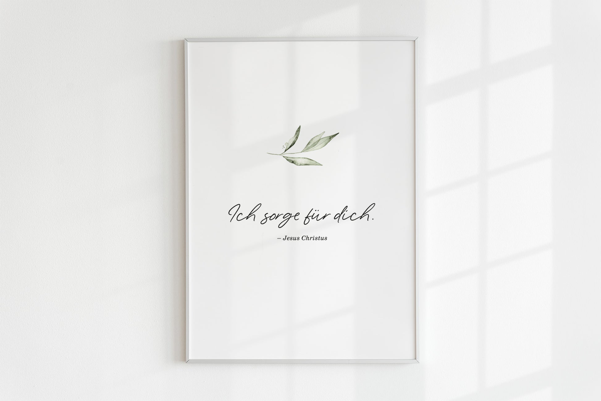 Ich sorge für dich: Wunderschönes Poster mit christlichem Inhalt auf 170 g Papier (ohne Bilderrahmen). Dieses hochwertige Poster ist in den drei Größen A4, A3 und im Kunstdruck-Format 50 × 70 cm bestellbar.