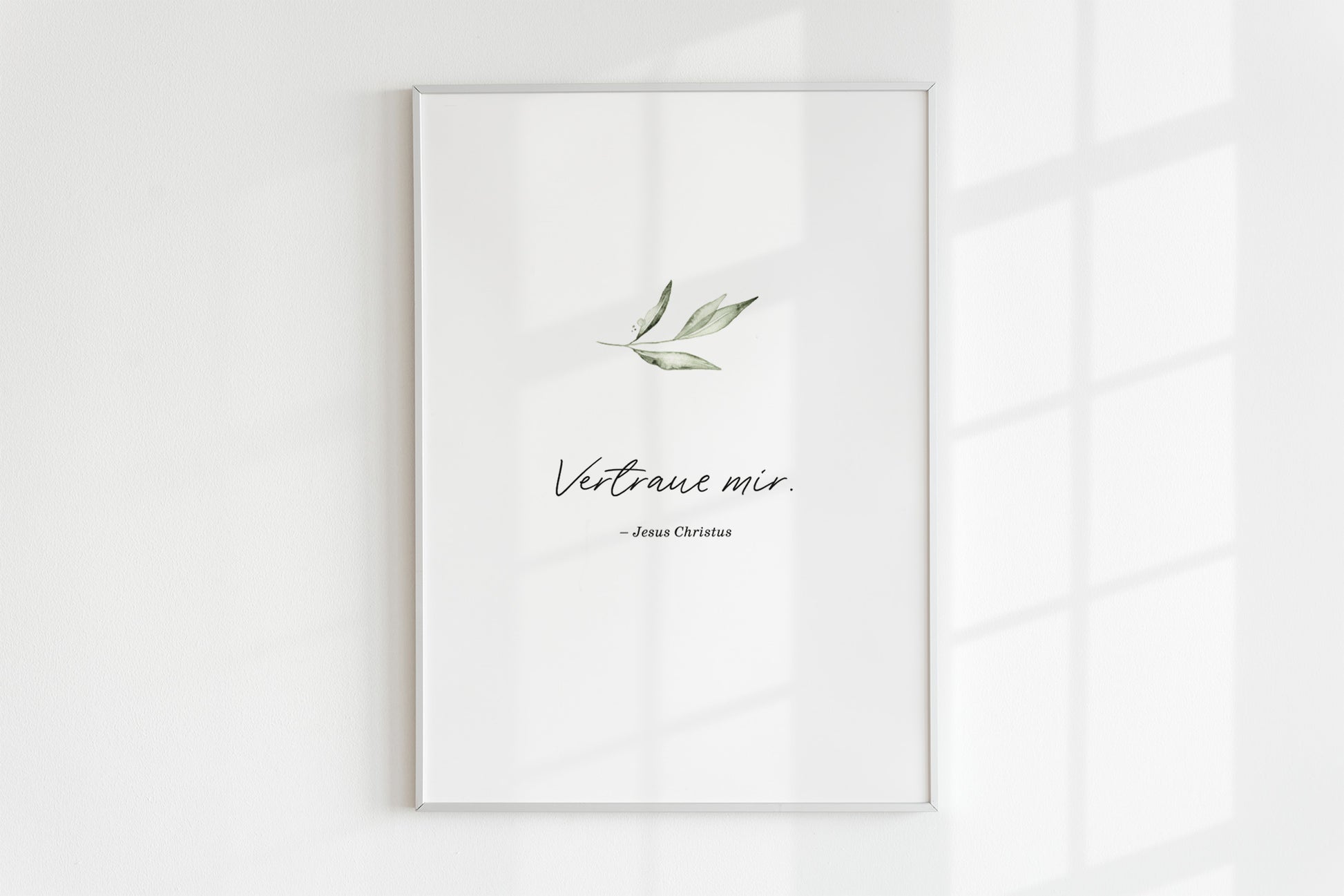 Vertraue mir: Wunderschönes Poster mit christlichem Inhalt auf 170 g Papier (ohne Bilderrahmen). Dieses hochwertige Poster ist in den drei Größen A4, A3 und im Kunstdruck-Format 50 × 70 cm bestellbar.